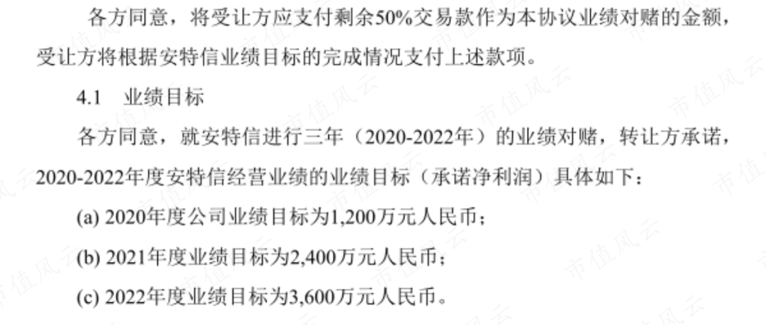 需要指出的是,该交易发生在2021年,而安特信的业绩对赌期包括2020年,显然,这一年的业绩承诺对上市公司毫无意义。