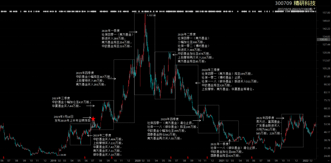 上文提到精研科技股价从2019年2月的25元(除权前)左右开始上涨,最高涨到2020年2月的157元(除权前),区间涨幅超5倍。