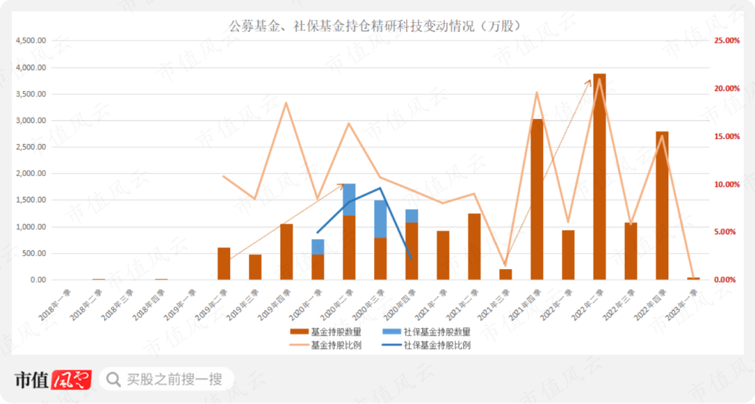 社保基金、公募基金持仓变动与精研科技的股价走势见下方示意图: