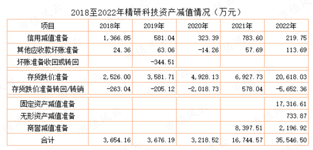 精研科技历年资产减值情况见下表: