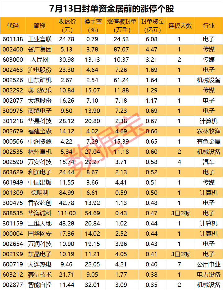 以封单金额计算,7股封单金额超亿元,其中工业富联、省广集团、人民网封单金额居前,分别为6.08亿元、4.47亿元、3.21亿元。