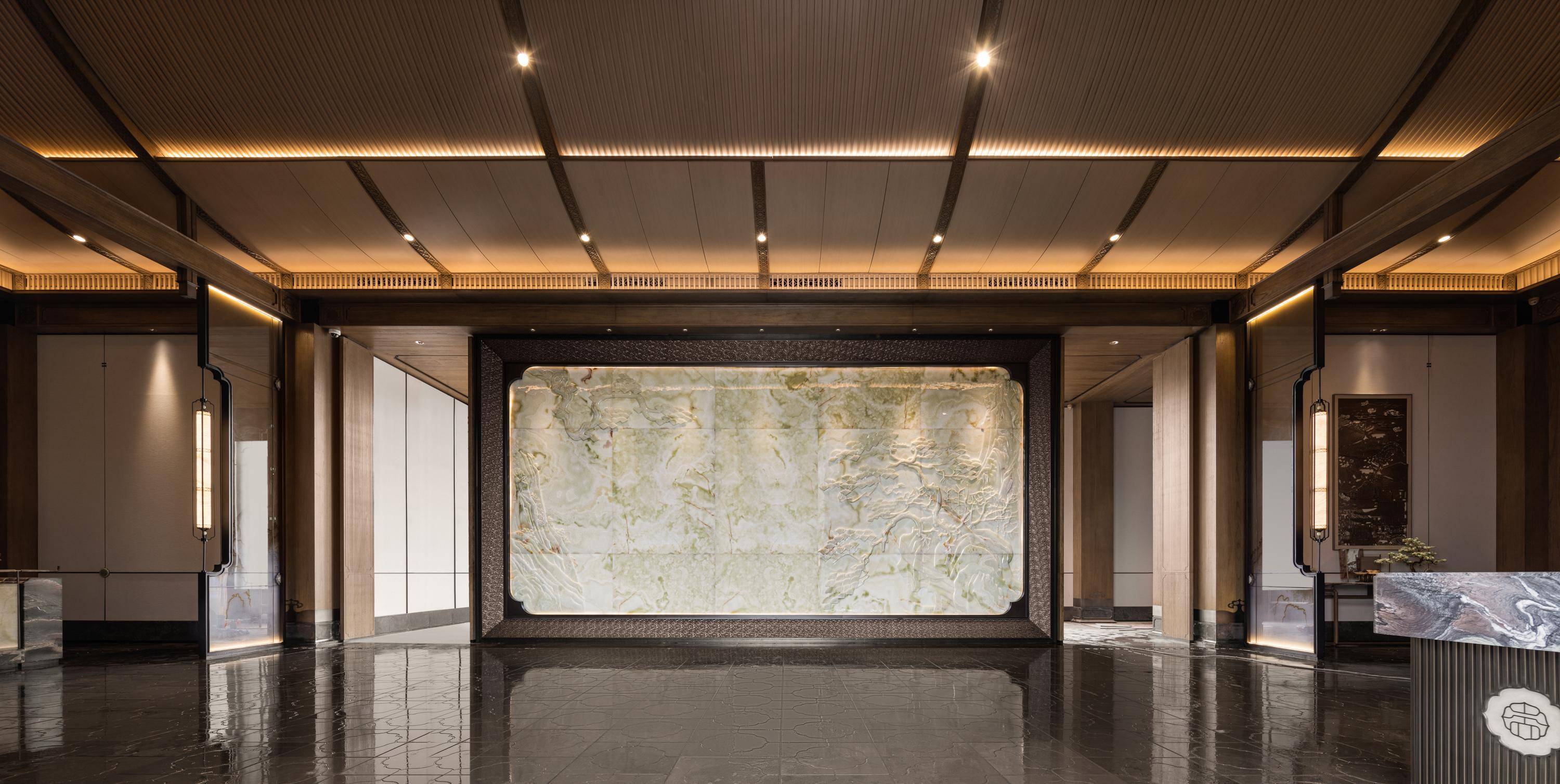 入口大堂8米挑高,有着接近100平方米的悬空。正面的照壁运用天然的玉石,通过手工雕花创造出了一幅山水画。穿过玉石照壁,在这样的建筑空间后方,小区还配置了下沉式的主题会所,实现了功能分区的同时,也让会所成为景观之一。
