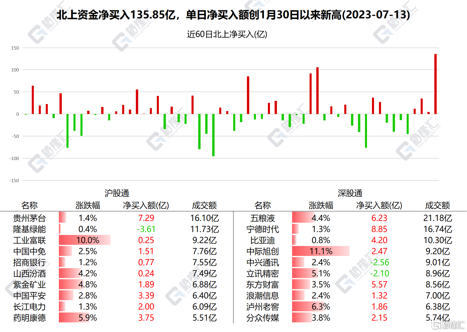 7月13日,北向资金净买入A股135.85亿元,连续4日加仓。其中,沪股通净卖出2.67亿元,深股通净买入7.62亿元。