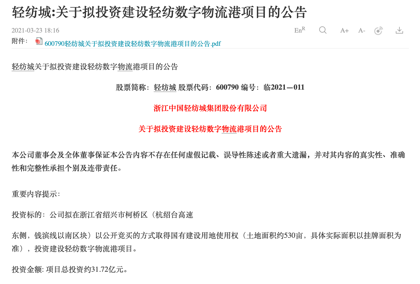 2021年3月23日,轻纺城披露关于拟投资建设轻纺数字物流港项目的公告,拟在浙江省绍兴市柯桥区(杭绍台高速东侧,钱滨线以南区块)以公开竞买的方式取得国有建设用地使用权(土地面积约530亩),投资建设轻纺数字物流港项目。