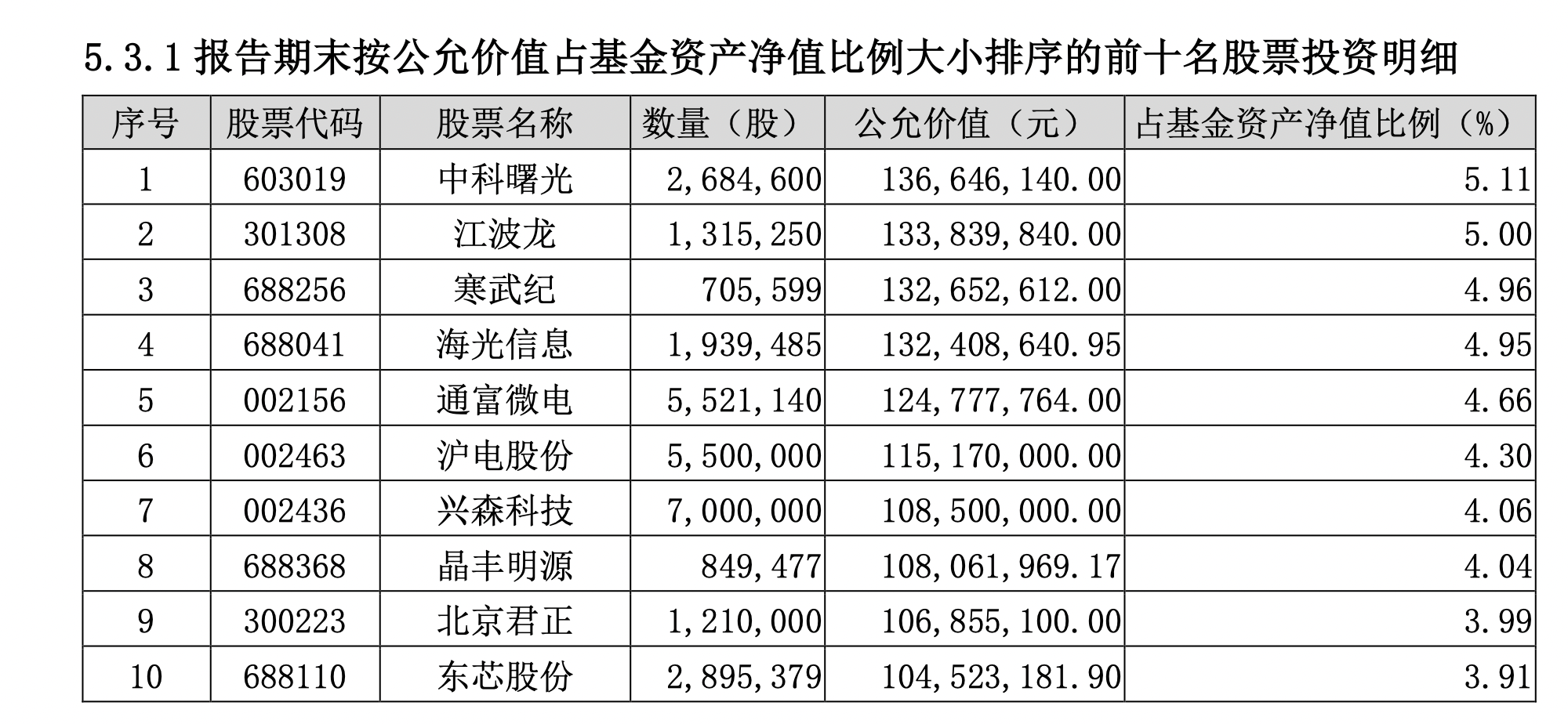 在持仓方面,德邦半导体产业在二季度进行了“大换血”,前十大重仓股分别为:中科曙光(603019)、江波龙(301308)、寒武纪(688256)、海光信息(688041)、通富微电(002156)、沪电股份(002463)、兴森科技(002436)、晶丰明源(688368)、北京君正(300223)、东芯股份(688110)。合计占基金资产净值比例为44.98%。
