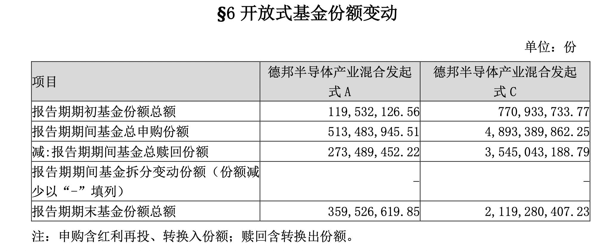 具体来看,德邦半导体产业A类份额、C类份额在二季度分别获得了23.99亿元、13.48亿份的净申购。尤其是C类份额,申购数量接近49亿份,这也使得该基金的份额规模在二季度出现了大幅增长,C类份额从期初的约7.71亿份,大幅增加至21.19亿份。