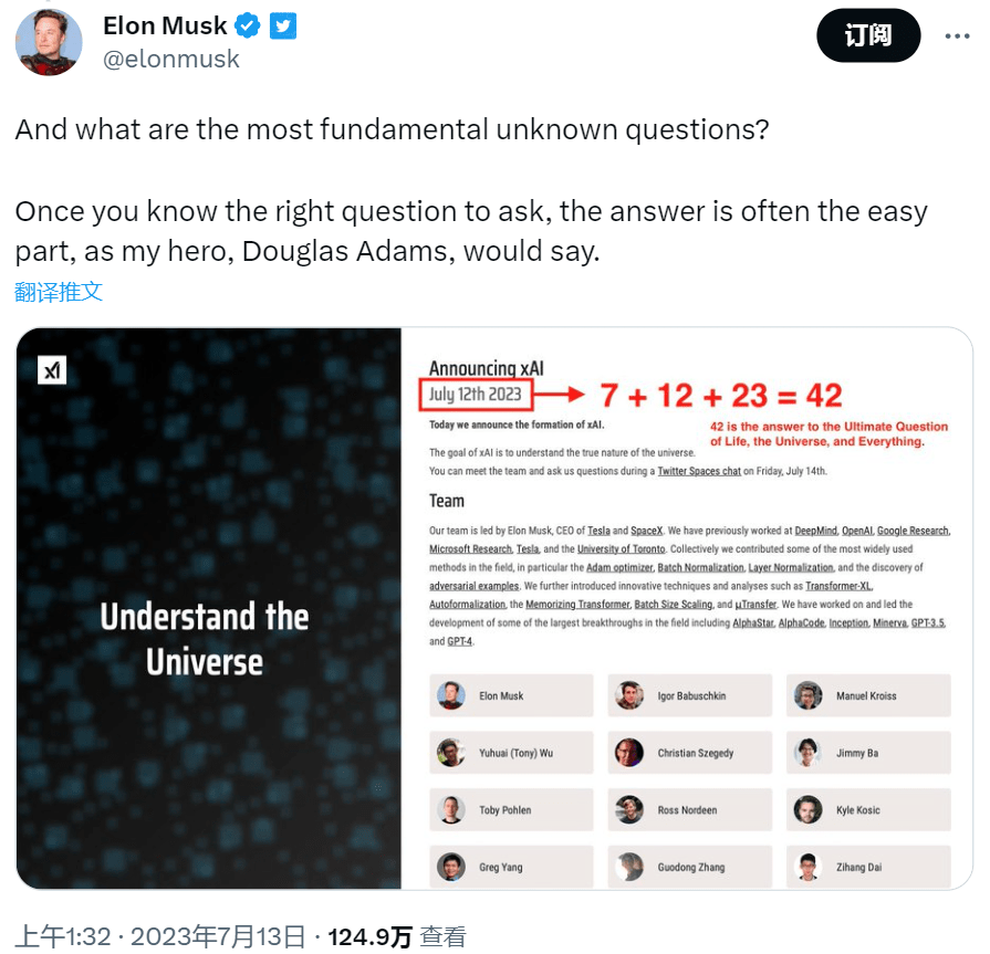对了,马斯克还表示,他选择在 2023 年 7 月 12 日宣布 x.AI,是因为他想借此纪念道格拉斯・亚当斯 (Douglas Adams) 的《银河系漫游指南》。