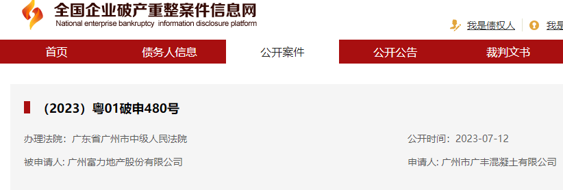 据7月13日全国企业破产重整案件信息网披露的信息,广州富力被广东祥正商贸有限公司(以下简称“祥正商贸”)、广州市广丰混凝土有限公司(以下简称“广丰公司”)申请破产重整,理由是“广州富力资产不足、缺乏清偿能力。”
