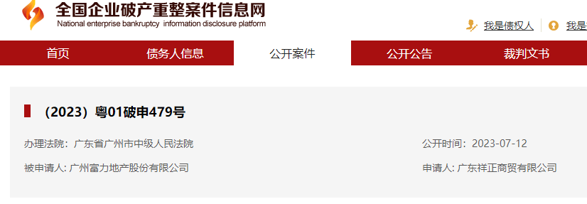 其中一则案号为(2023)粤01破申479号,申请人为祥正商贸;另一则案号为(2023)粤01破申480号,申请人为广丰公司。