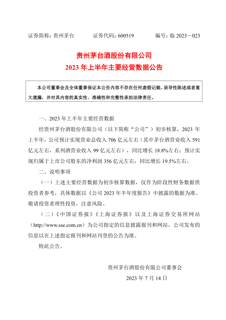 7月13日,贵州茅台发布2023年上半年业绩预告。