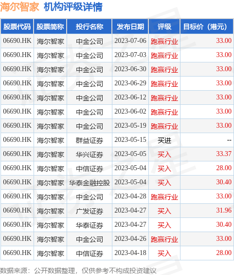 截至2023年7月13日收盘,海尔智家(06690.HK)报收于24.5港元,上涨1.03%,换手率0.17%,成交量480.79万股,成交额1.18亿港元。投行对该股的评级以跑赢行业为主,近90天内共有9家投行给出跑赢行业评级,近90天的目标均价为31.94港元。中金公司最新一份研报给予海尔智家跑赢行业评级,目标价33港元。