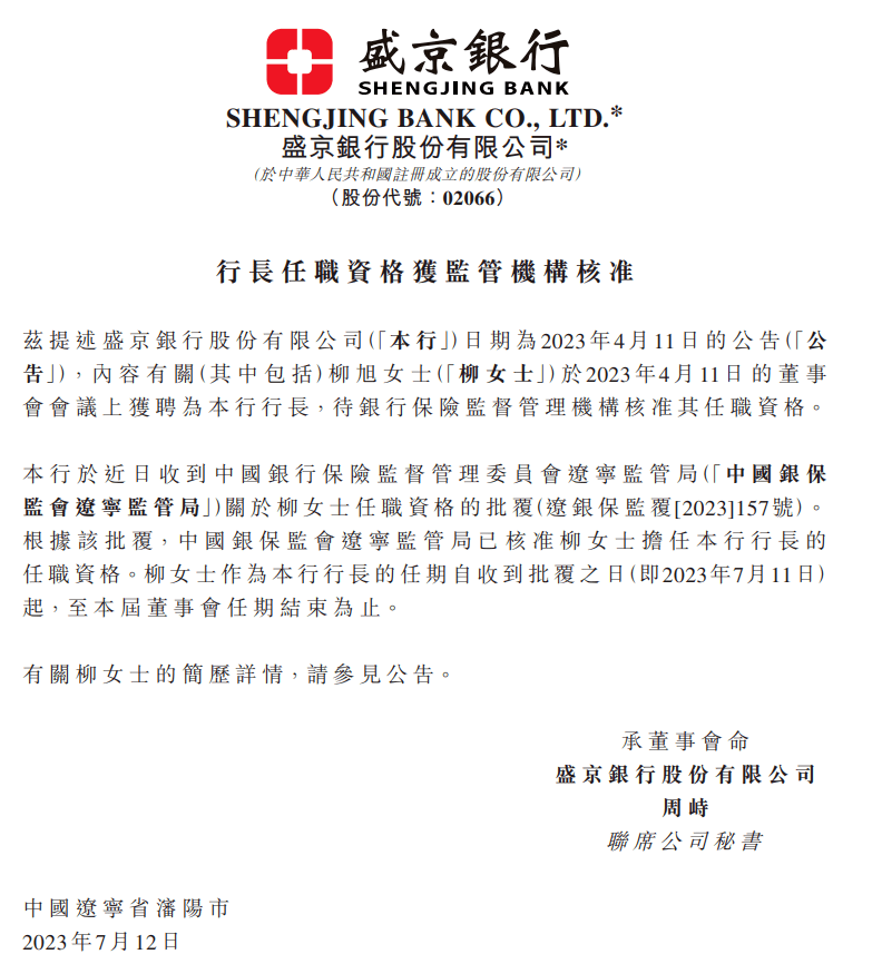 7月12日,盛京银行(02066.HK)公告称,该行于近日收到中国银行保险监督管理委员会辽宁监管局关于柳旭任职资格的批复。根据该批复,监管已核准柳旭担任该行行长的任职资格。