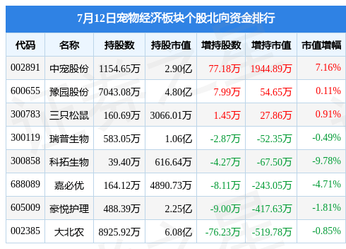 北向资金方面,当日宠物经济板块北向资金持股市值为17.95亿元,增持727.09万元。其中增持最多的是中宠股份,增持了0.19亿元。减持持最多的是大北农,减持了519.78万元。宠物经济板块北向资金持股变动明细见下表: