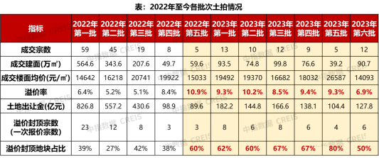 上半年共完成7次集中供地(2022年五批次于2023年完成出让),合计出让涉宅用地66宗。上半年供地节奏明显加快,且每次供地量少质优,土拍热度逐步攀升,具体呈现以下特征: