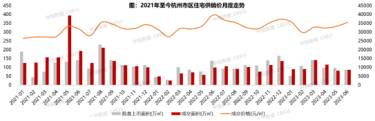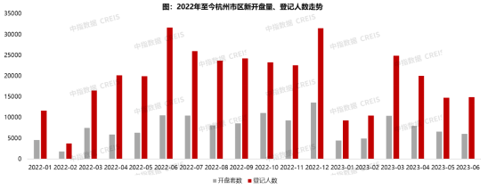 上半年杭州市场呈现出先扬后抑、先热后淡的走势。2023年初受益于疫情管控全面解绑,加上降低利率、调控政策持续优化等外部利好因素刺激,购房者积压的需求集中释放,市场出现了久违的小阳春行情,成交量持续走高,尤其是3月申花、钱二、奥体、世纪城等热门板块房源供应不断,成交创21年9月以来最高峰。