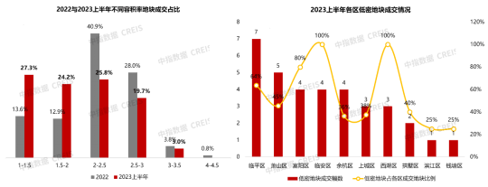 容积率低于2.0的低密地块供应大幅提升,占比高达52%,其中容积率1-1.5地块出让幅数占比27.3%,容积率1.5-2的地块占比为24.2%,较2022年分别提升13.6、11.4个百分点。