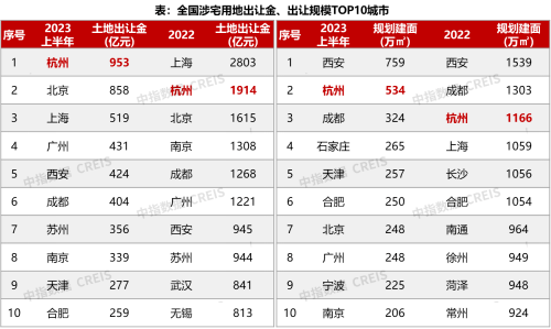 对比全国土拍市场,杭州活跃度较高,上半年经营性用地出让金额仅次于北京,位居全国第二,但 涉宅用地出让金953亿元回归全国第一,领先北京95亿元。出让规模触底回升,但同比2022上半年仍有明显降幅,上半年成交建面534.2万方,同比下跌41%,处于近几年相对低位。土拍热度提升明显,上半年平均溢价率9.3%,环、同比均有超3.4个百分点的提升。