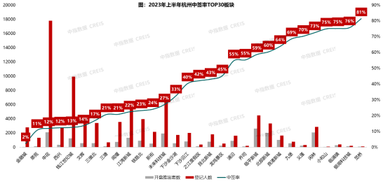 上半年,杭州市区新开盘房源40354套,总计产生了193次摇号,摇号率62.1%,累计有94320户购房家庭入场摇号选房,环比减少38%,平均中签率42.8%,环比上升2.3个百分点。开盘市场表现整体不如2022年,摇号人数大幅减少,流摇率和中签率也呈现走高趋势。