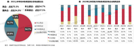 自2023年一批次,杭州本土民企拿地金额占比持续扩大,从一批次的38.9%增长至六批次79.2%,上半年合计占比达54.4%,若加上外来民企份额,民企对杭州上半年土地出让金贡献高达75.5%。