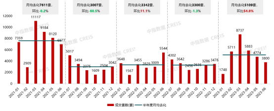 月度市场呈现倒“V”型走势。1月由于春节假期,市场低迷开局;2月复工,前期低迷市场压抑的需求开始集中释放,成交量快速增长;3月成交规模达到峰值8737套,市场热度直追2021年上半年。经过一轮需求释放,市场复苏后继乏力,4月成交规模开始持续下降,环比跌幅近2成,6月成交量跌破4000套。