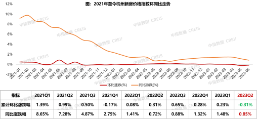 根据2023年上半年,杭州新建住宅价格环比累计下跌0.08%。5月开始,新房价格指数结束2022年以来持续16个月的环比上涨态势,6月最新价格指数环比下跌0.12%至29443元/㎡,同比涨幅缩减至0.85%。究其原因,一季度杭州如江湾新城、申花等核心盘推盘入市相对较多,5月起略有下滑,结构性因素致使价格指数略有回落。