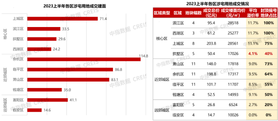 分区域看,近郊城区中,余杭出让建面114.8万方领跑全市,土地出让金198.8亿元,与上城区203.8亿元仅5亿之差。核心区拱墅拍地热度较低,平均溢价率4.1%、封顶摇号地块占比40%均落后,上半年出让5幅地块中,4幅地块因地段、商办类物业等问题,均以底价成交。