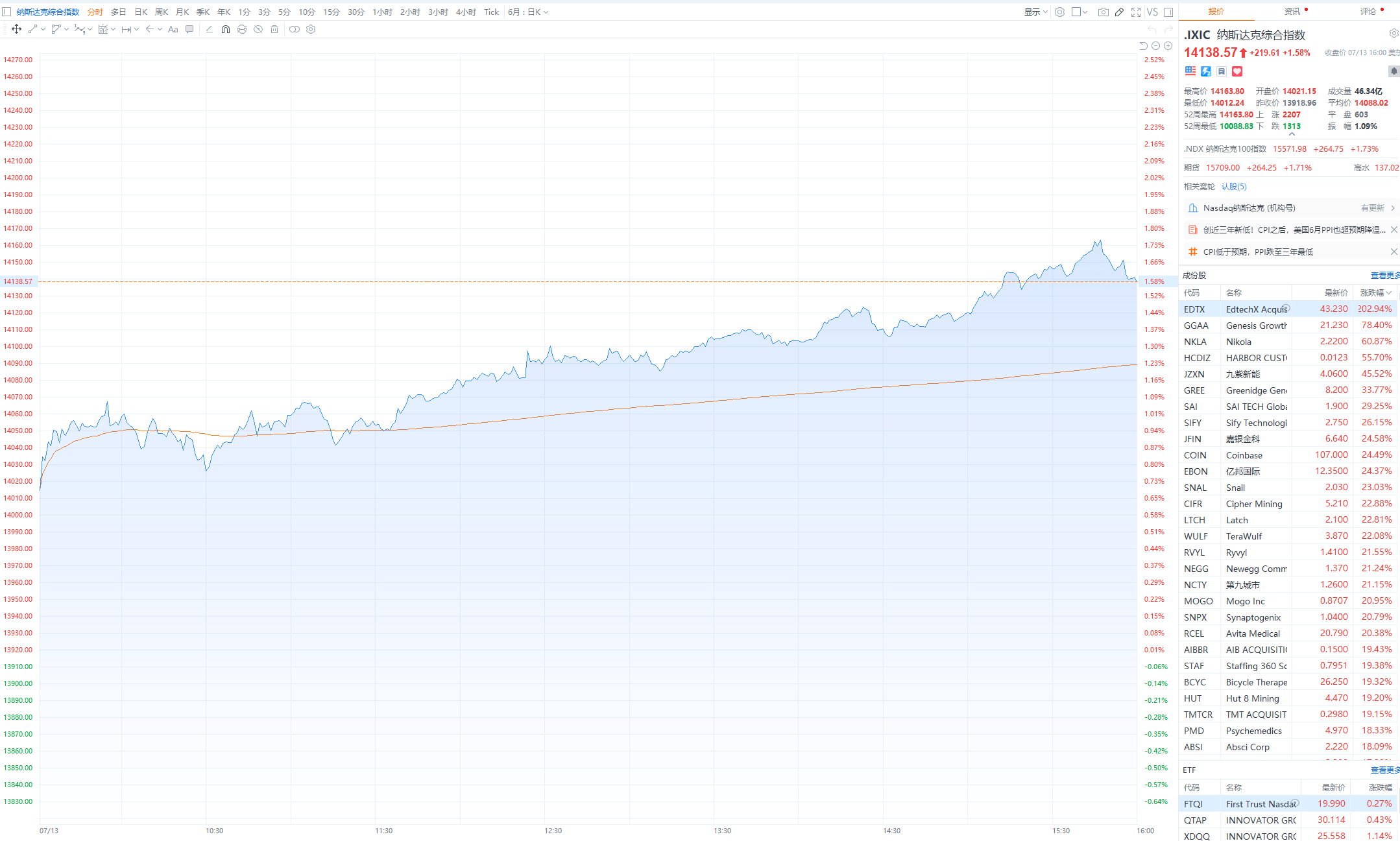 【美股日线周期4连涨 Coinbase创2022年5月6日以来收盘新高】财联社7月14日电,美股三大指数集体收涨,日线周期4连涨,纳指涨1.58%,标普500指数涨0.85%,道指涨0.14%。加密货币交易所Coinbase涨超24%,创2022年5月6日以来收盘新高。电动汽车生产商Nikola收涨61% 创2020年6月份以来最大单日涨幅。大型科技股集体上涨,谷歌涨超4%,特斯拉、亚马逊涨超2%,奈飞、脸书、微软涨超1%,苹果小幅上涨。