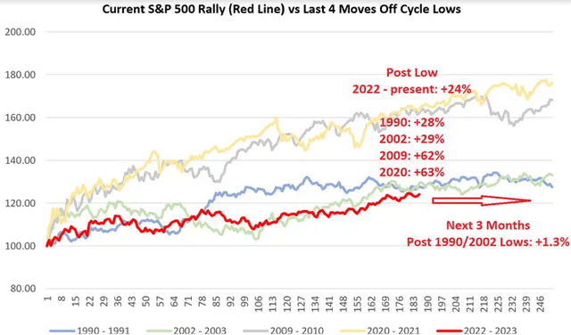 “如果这种情况继续下去,该指数可能在未来三个月基本持平,直到去年10月低点出现一周年后。以1990-1991年和2002-2003年的平均值作为参考,标普500指数在接下来的66个交易日里可能只会上涨1.3%”,拉贝表示。