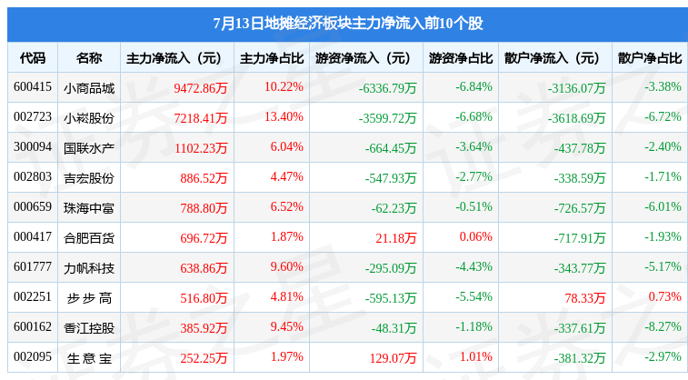 从资金流向上来看,当日地摊经济板块主力资金净流出1.89亿元,游资资金净流出9740.51万元,散户资金净流入2.86亿元。地摊经济板块个股资金流向见下表:
