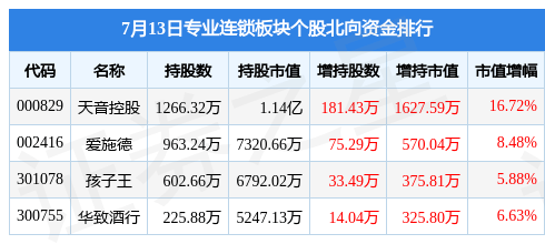 7月13日专业连锁板块较上一交易日上涨0.88%,华致酒行领涨。当日上证指数报收于3236.48,上涨1.26%。深证成指报收于11095.44,上涨1.61%。专业连锁板块个股涨跌见下表: