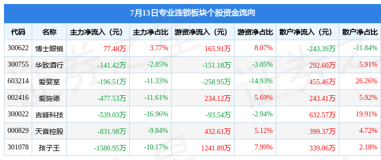 从资金流向上来看,当日专业连锁板块主力资金净流出3689.94万元,游资资金净流入1570.87万元,散户资金净流入2119.08万元。专业连锁板块个股资金流向见下表: