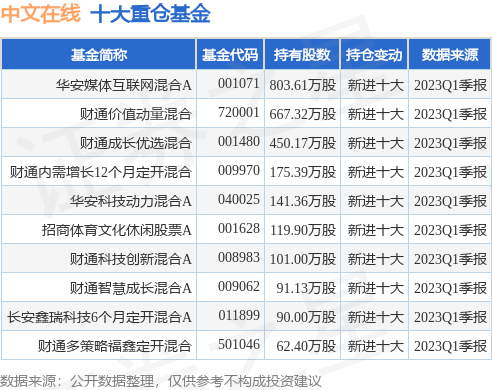 根据2023Q1季报公募基金重仓股数据,重仓该股的公募基金共20家,其中持有数量最多的公募基金为华安媒体互联网混合A。华安媒体互联网混合A目前规模为61.4亿元,最新净值3.102(7月12日),较上一交易日下跌2.27%,近一年上涨9.19%。该公募基金现任基金经理为胡宜斌。胡宜斌在任的基金产品包括:华安智能生活混合A,管理时间为2019年5月8日至今,期间收益率为142.18%;华安成长创新混合A,管理时间为2019年6月27日至今,期间收益率为119.97%;华安沪港深外延增长灵活配置混合A,管理时间为2022年1月26日至今,期间收益率为-6.56%。