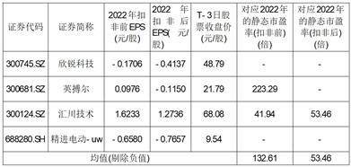 注3:计算2022年扣非前静态市盈率算术平均值时,剔除异常值欣锐科技、精进电动-uw;计算2022年扣非后静态市盈率算术平均值时,剔除异常值欣锐科技、英搏尔、精进电动-uw。