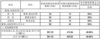 2、公司2022年限制性股票激励计划首次授予的限制性股票第一期共计解锁数量为:460.84万股。
