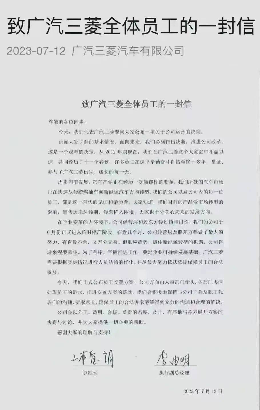 信上写道,广汽三菱目前的产品受市场转型的影响,销售远未达预期,公司经营陷入困境。在行业变革的大环境下,广汽三菱经营层和股东方经过慎重讨论,公司于6月份正式进入临时停产阶段。与此同时,广汽三菱需要根据实际情况进行人员结构的优化。