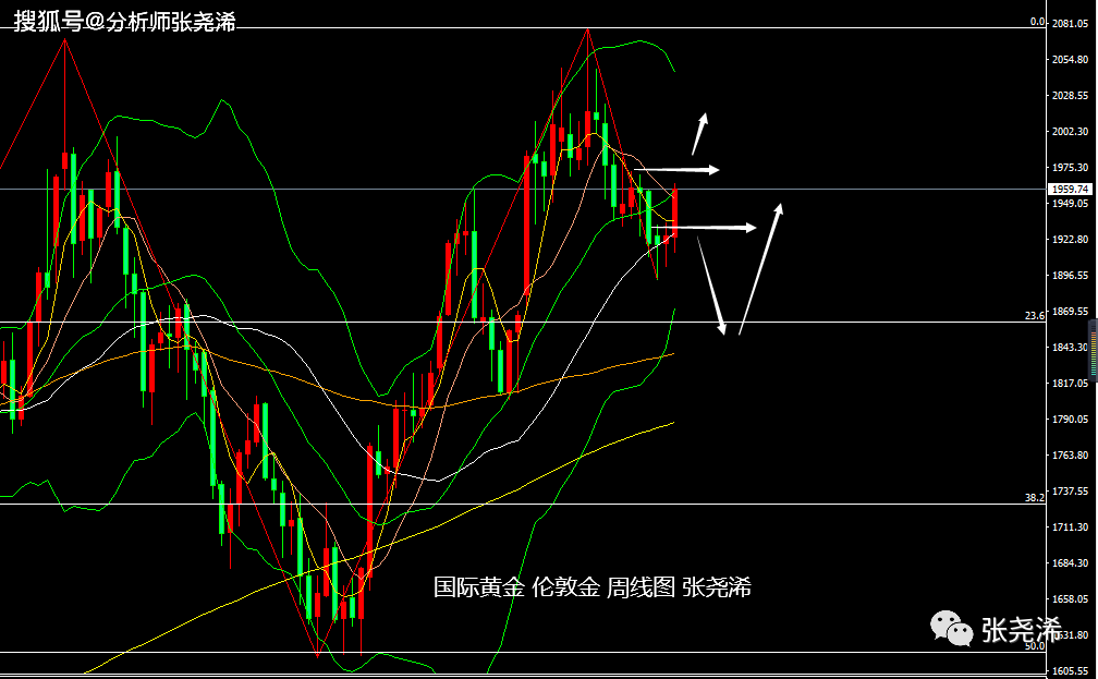 周线级别:金价本周在前两周收取的触底回升止跌看涨形态下,持续发力走强,目前在突破5周均线阻力后,也进一步如期突破10周均线阻力,且看涨动力仍然持稳,附图指标MACD看跌动能柱持续缩减,KDJ已转为金叉向上发展,目前也在测试中轨线阻力情况,如持稳突破,后市将进一步看涨至2000美元关口,否则将有回落的需求,但回落不破转为支撑的5周均线,则仍有陷入横盘震荡待回升走强的前景。