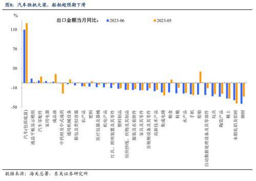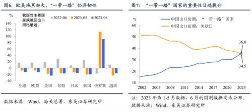 我们在之前的报告《今年出口还有什么“顺风”可以依赖?》已经分析过,2023年出口额外的改善动力来自于三个方面:美国地产企稳带来全球贸易的向上重估;在外交的努力下,欧美尤其是欧洲进口中中国份额的下降速度可能会放缓;一带一路10周年下,中国在其中主要经济体中的进口份额可能会加速上升。我们测算,这可能使得2023年出口增速修复1.6至2.9个百分点(图5)。而能不能把2023年的出口跌幅压缩到-5%以内、甚至-3%以内,6月的这个“偏差”有重要的意义。除此之外,具体数据方面: