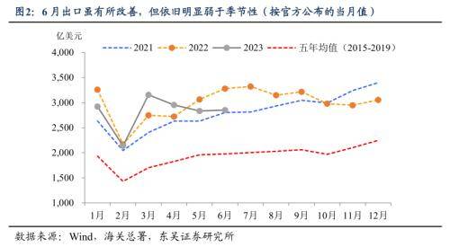 我们假设一种极端的情形,出口往后不出现季节性上涨(一般下半年的出口规模会明显高于上半年)、接下来每个月的出口规模和6月一致,如果6月规模是2853亿美元,那么对应2023年出口增速约为-5.4%,如果是后者,对应的2023年出口增速则低至-9.7%。当然实际的情况会好于以上假设的情形,主要基于两方面的考虑: