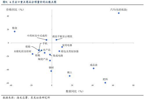 与此相反的是船舶出口增速大跌,在今年以来船舶出口持续保持高增速的情形下,6月的颓势似乎有些超预期,更可能反映的是全球航运的景气程度,需关注后续这一现象是否持续。此外,玩具、陶瓷等劳动密集型产品以及手机、自动数据处理设备、集成电路等电子半导体行业则延续低迷(图8,9)。