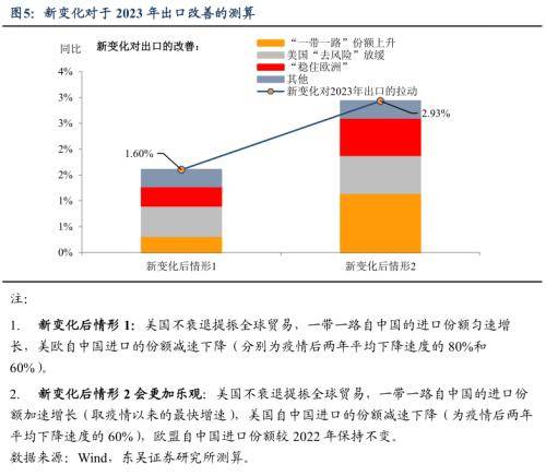 今年美国衰退的概率已经大大降低,基数会成为决定出口节奏的重要因素。我们在之前的报告《房地产软着陆后,美国经济衰退还有戏吗?》中指出由于美国地产的企稳和稳健的就业,美国今年衰退的概率已经很小了,在这一核心外部扰动要素减弱的情况下,2022年的基数将成为影响2023年出口同比增速的主要“内因”——6、7月将是同比低点。