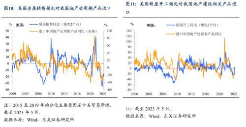 地产类产品出口未来可能受美国地产回暖的外溢效应影响。值得关注的是,家用电器本月成为少数几个出口正增长的产品,主要受出口数量带动,或许一定程度上反映了天气炎热带来的家电需求上升。此外,我们在此前的报告中提到美国地产回暖对我国地产类产品进口具有领先作用,且具有较高的进口依赖度,后续可关注美国地产回暖的持续性以及对我国出口的外溢效应——这对于建筑建材、通用机械以及家电家具出口都有一定的提振效果(图10,11)。