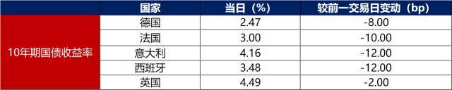 7月13日,主要欧洲经济体10年期国债收益率普遍大幅下行。其中,德国10年期国债收益率下行8bp至2.47%;法国、意大利、西班牙、英国10年期国债收益率分别下行10bp、12bp、12bp和2bp。