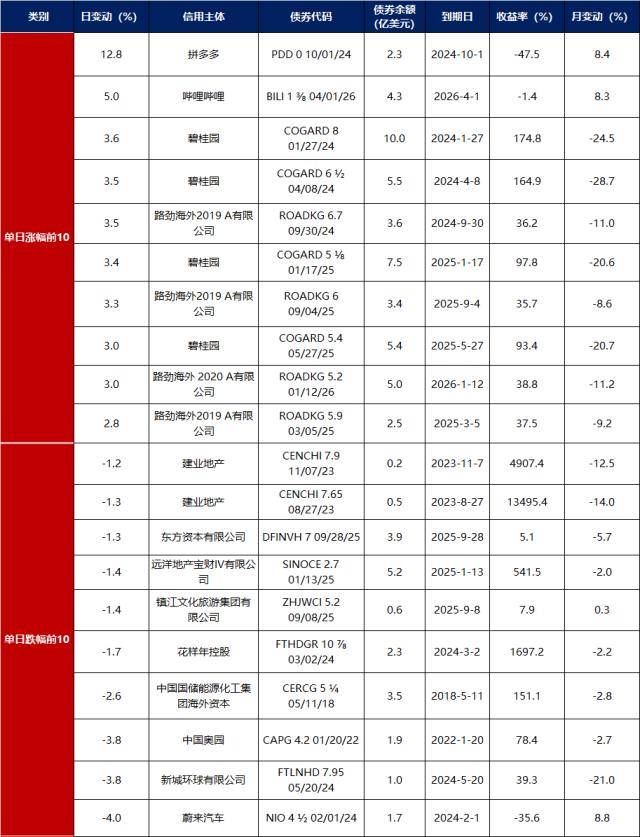 7月13日,地产债成交价格整体稳定。5只债券成交价格偏离幅度超10%,“21金地01”跌超11%;“H9金科03”涨超13%,“H0金科03”涨超19%,“21碧地02”涨超44%,“21碧地01”涨超46%。