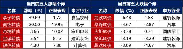 【转债市场指数集体收涨】7月13日,受权益市场明显提振,转债市场主要指数集体走强,当日中证转债、上证转债、深证转债分别上涨0.46%、0.47%、0.46%,转债市场日成交额645.69亿元,较前一交易日减少54.70亿元。当日转债市场个券多数上涨,496只个券中404只上涨,90只下跌,2只持平。当日,新上市李子转债收涨39.69%,领跑市场,同时商洛转债受益于正股提振,也现20%涨停,此外奇精转债、金诚转债涨超5%,也表现较佳;当日下跌个券数量进一步减少,除海波转债跌逾6%,华锋转债跌逾4%,火炬转债、全筑转债、超达转债跌逾3%,其余个券跌幅不大。