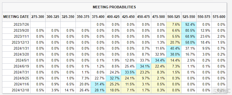 据CME“美联储观察”最新显示,美联储7月维持利率在5.00%-5.25%不变的概率为7.6%,加息25个基点至5.25%-5.50%区间的概率为92.4%;到9月维持利率不变的概率为6.6%,累计加息25个基点的概率为80.5%,累计加息50个基点的概率为12.9%。