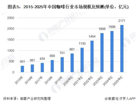 随着人均消费的增长,居民对生活质量的要求不断提高,年轻一代对咖啡饮品的喜爱逐渐提升,带动咖啡行业快速增长。据统计,中国咖啡消费年均增速达15%,远高于世界2%的增速。随着我国人民生活水平的提高和对咖啡文化认知程度的增长,加之巨大的人口红利,都可能刺激国内咖啡消费。预计2025年中国咖啡市场规模将达到2171亿元。