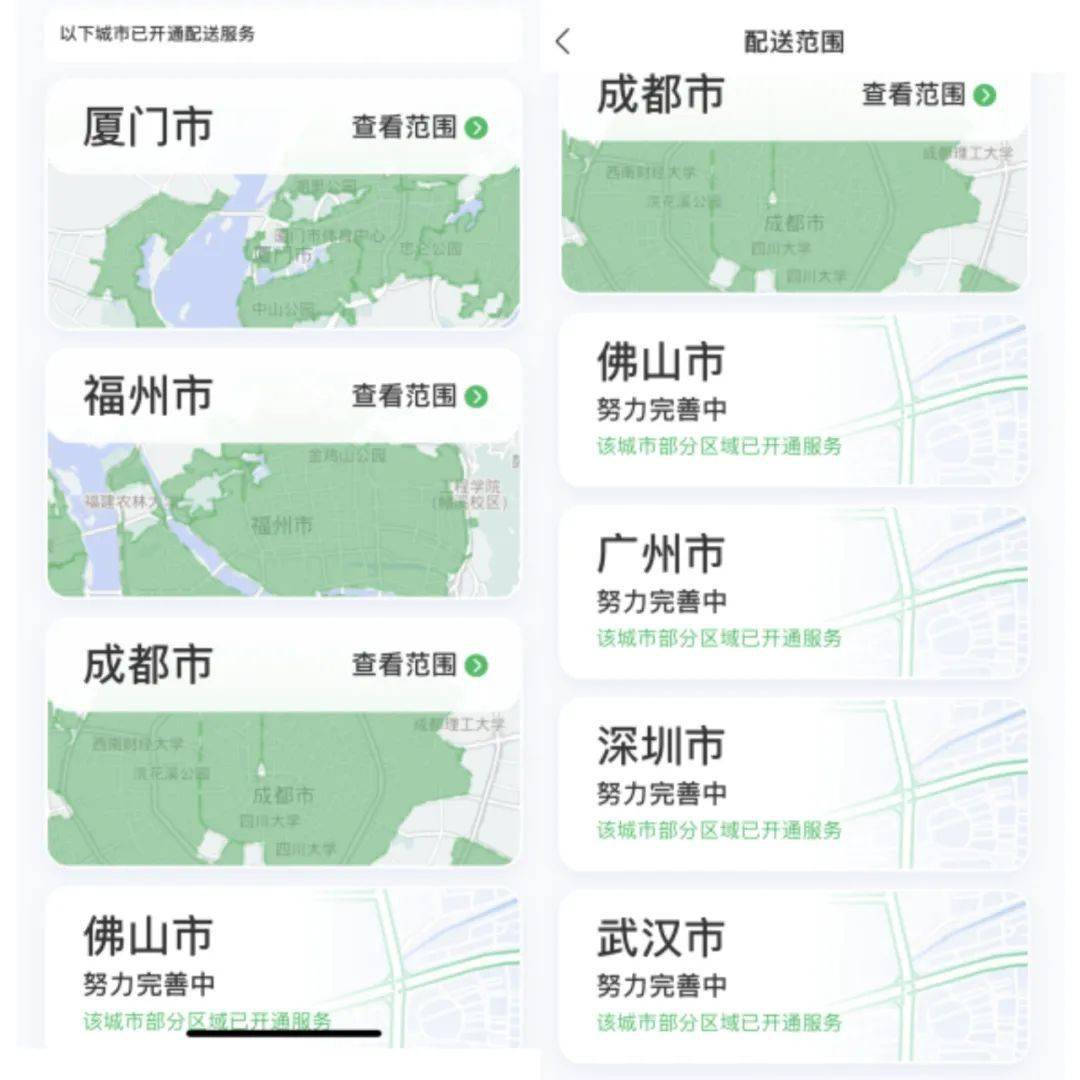 7年累计拓城7座,朴朴超市的整体发展并不快。不同城市还存在配送服务差异,如下图所示,厦门、福州、成都三城拥有全城服务范围,而其他四城仅部分区域拥有配送服务。