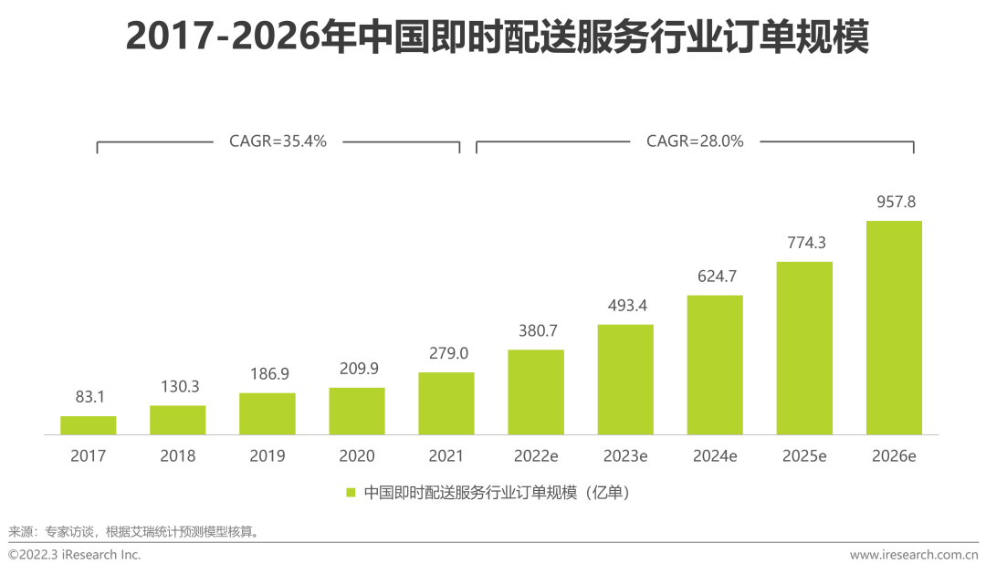 即时零售正处风口。艾瑞咨询报告数据显示,在2021年-2026年即时配送服务行业订单规模复合增速预计将达28%。