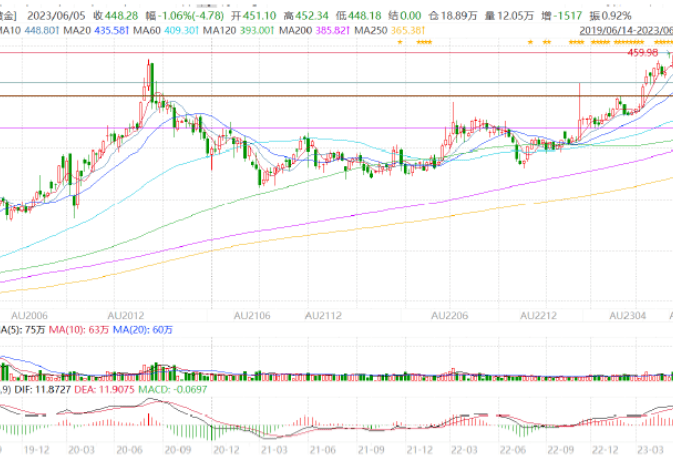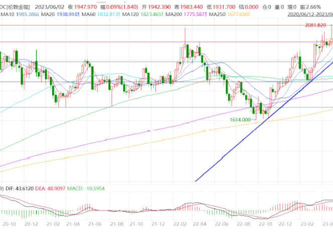 从技术面看,黄金2 月初回落,在1800美元/盎司附近得到支撑,同时在60 日均线附近横盘震荡,3 月初受到欧美银行流动性危机黄金大幅上涨,加上美国债务上限危机逼近,4月初和5月初有两次向上突破走势。随着避险情绪的好转,5 月COMEX 黄金下跌0.22%至1995.1 美元/盎司,美元指数上涨1.86%至103.55。伦敦金现整体在 1931.7-2081.82 美元/盎司区间冲高回落,跌幅为 1.38%;受人民币贬值影响,沪金整体在 443.62-459.98 元/克区间震荡偏强运行,小幅上涨1.53%。2023年下半年,黄金还将继续高位区间运行的概率大。