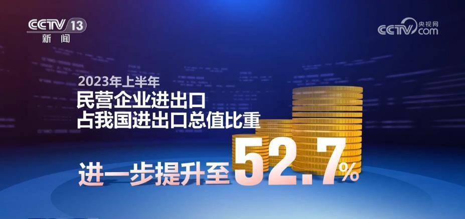 央视网消息:海关总署介绍,2023年上半年,我国有进出口实绩的外贸企业数量54万家,同比增加6.9%。其中,民营企业进出口10.59万亿元,同比增长8.9%。